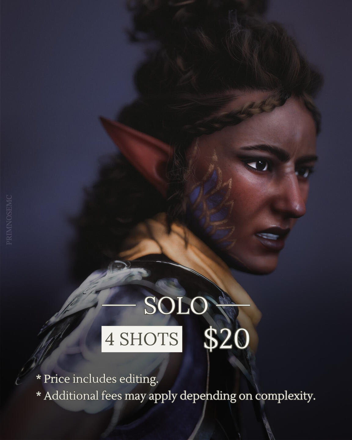 | ❂ | This is s "Surprise Me" type of commission. You may provide a general idea or your character background and personality, but once the photos are taken there will be no redone. |